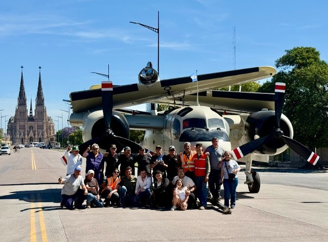 La imponente figura del Grumman Tracker —un avión diseñado originalmente para la búsqueda y reconocimiento antisubmarino— luce hoy renovada gracias a un intenso proceso de restauración que comenzó en mayo de 2024.